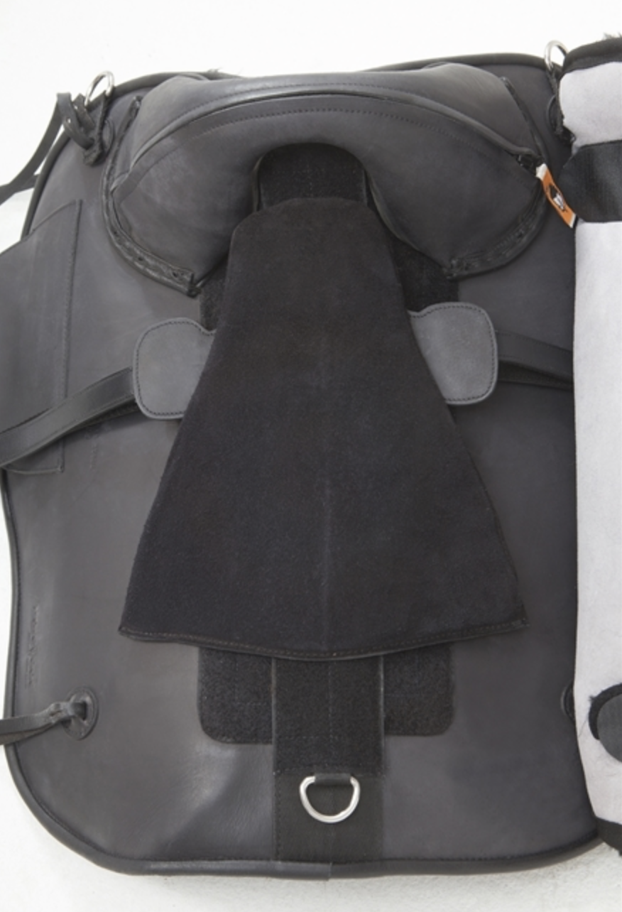 Tenemos un sistema de aparejo especialmente diseñado en estaMontura : dos correas circunferenciales se extienden a través y sobre el acolchado de cuero suave para evitar la irritación del pelaje o incluso peores puntos de presión en el vientre. Se requiere cincha de doma.
