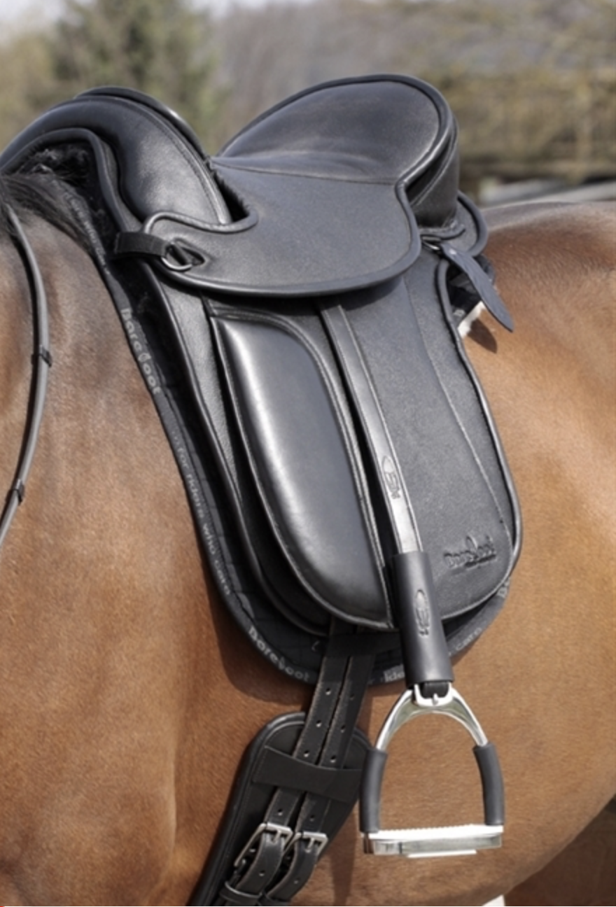 Solapa de rodilla acolchada. Viene con 2 pares de rodilleras (diferentes tamaños) y se puede sujetar con velcro según sus necesidades individuales. Esta montura también es muy adecuada para la monta trail y viene con 6 anillos en D para acoplar todas sus necesidades de ruta. El puente de fibra de vidrio (tamaño mediano) se puede cambiar como con todos las monturas Barefoot. Cuero con doble costura en todas las partes que soportan peso.
