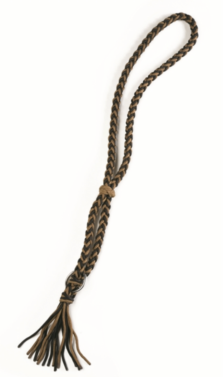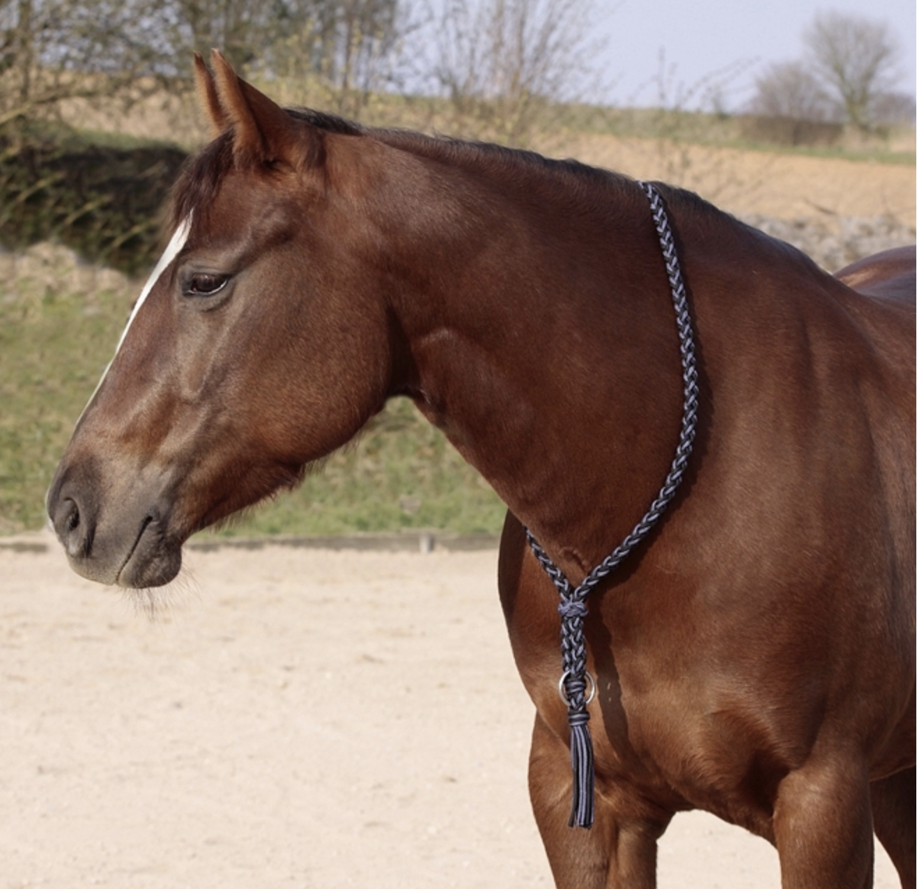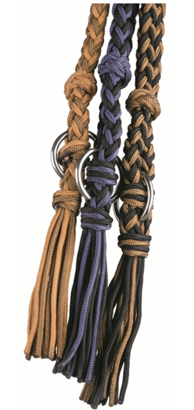 Collar de gran calidad para tu caballo, hecha de cuerda trenzada a mano . Tamaño ajustable mediante nudo deslizante. Incorpora una anilla de acero inoxidable para atar al caballo.