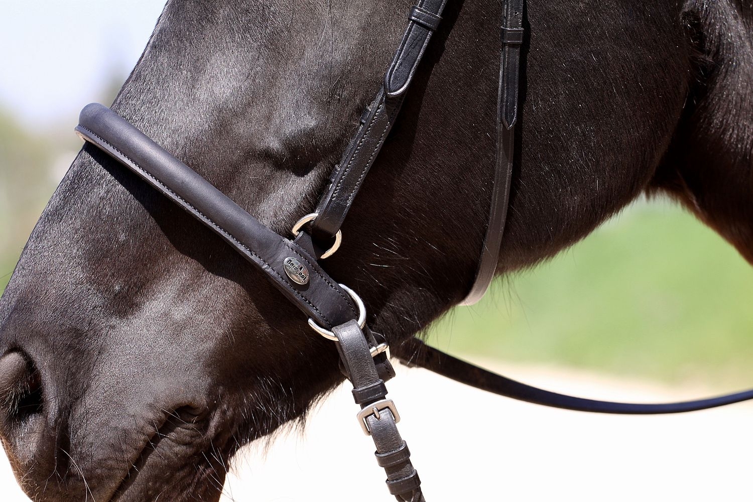 Muserola, ‘Shape-It’ ™ hecha de cuero genuino nobuck con anillos a cada lado para vincular las riendas.