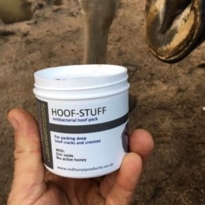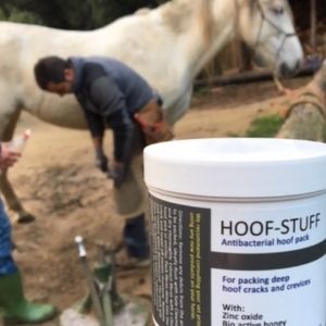 Hoof Stuff es una pasta indicada para rellenar las cavidades y los cuartos profundos de los cascos equinos. El producto contiene únicamente ingredientes naturales no tóxicos, seguro y fácil de usar. La textura fibrosa por su contenido de algodón permite que actúe más tiempo que otros productos. Hoof Stuff es muy útil tanto en las cavidades de las pinzas como en las de los abscesos y en las infecciones del surco central.