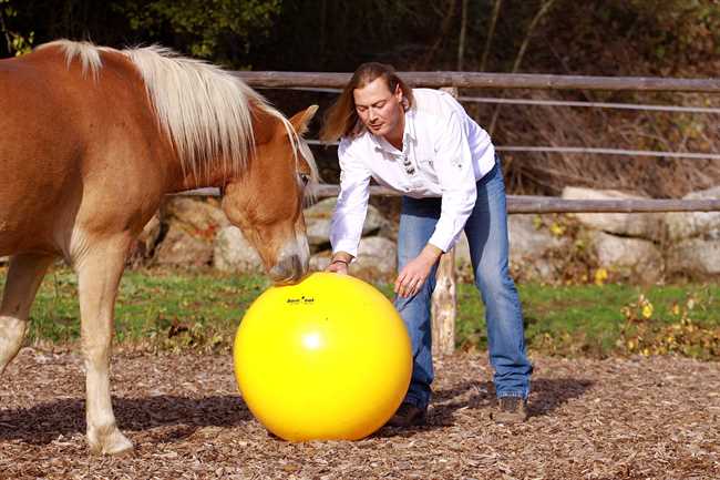 La pelota grande se puede hacer rodar con la nariz o patear con la pezuña, se usa para entrenar y para enseñarle a su caballo a aceptar objetos a su alrededor o debajo de su vientre. Producto disponible en amarillo.