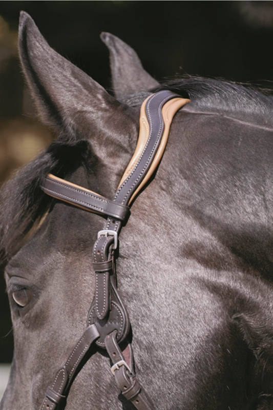 Brida de cuero suave, muy flexible y con testera anatómica que evita puntos de presión y molestias en las orejas.